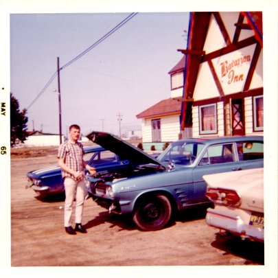 Jimmy Schlang with his (1964?) Pontiac Tempest. This was a six-cylinder dual-overhead cam engine with a rear transaxle. Jim had it hopped up pretty good. Taken in May of 1965.