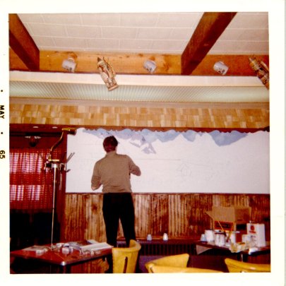 Taken in the inside of Schlang's, in the dining room looking north towards the stage. I believe this unknown individual was painting an Alpine mural behind the stage. Taken in May of 1965.